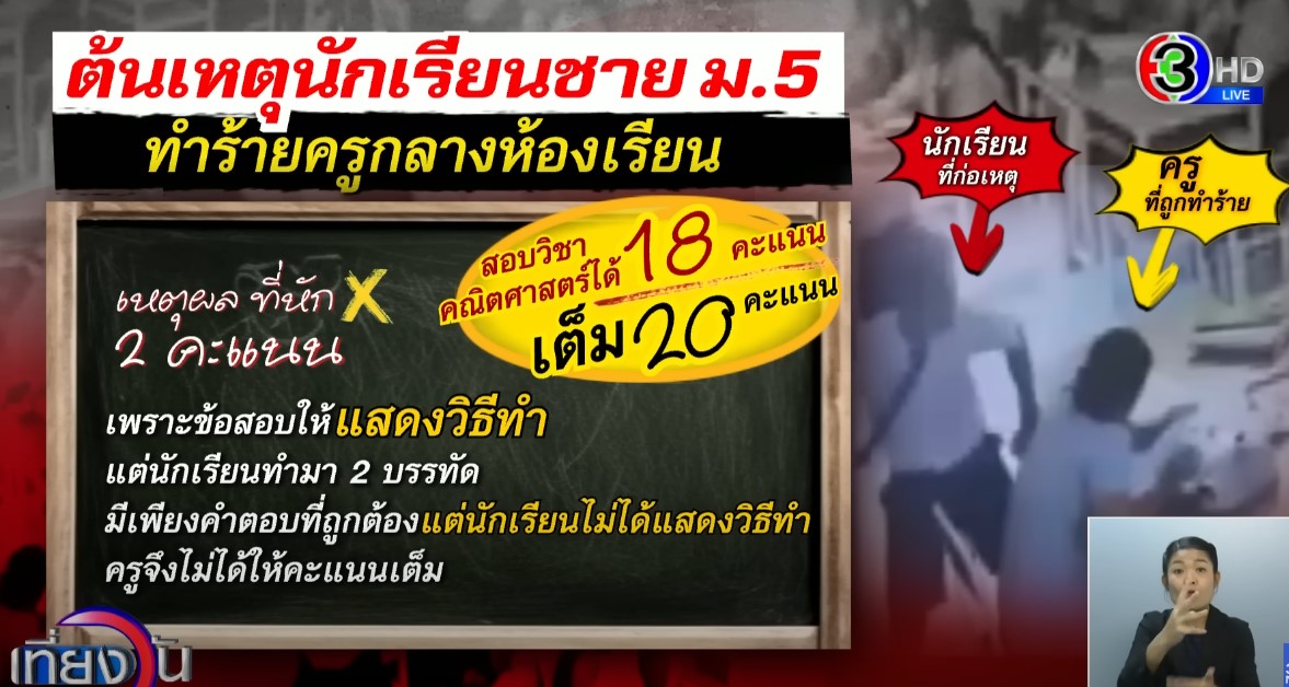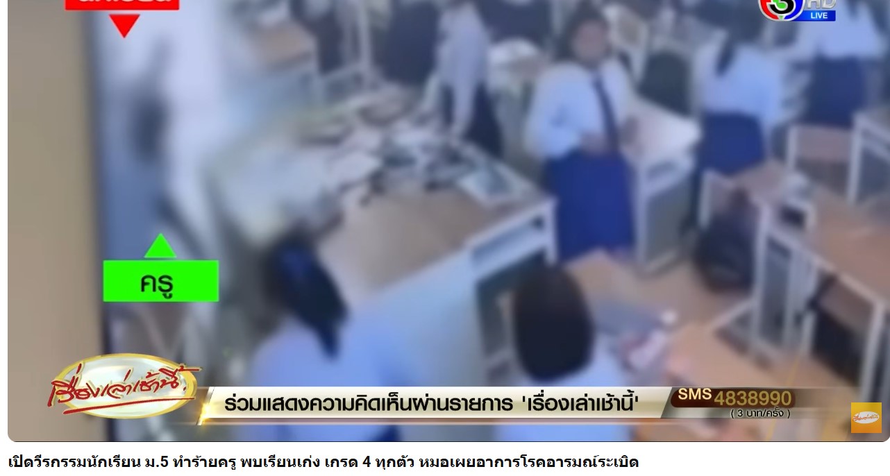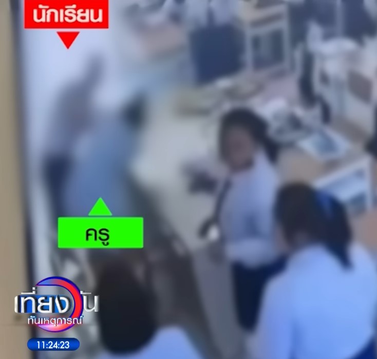 จากกรณีนักเรียนชายชั้น ม.5 ปรี่เข้าไปรัวหมัดใส่ครูสาว และเตะเข้าที่ลำตัวอีกหลายที ซึ่งขณะนั้นครูสาวนั่งอยู่ที่โต๊ะ หน้าห้องเรียน จนครูแทบล้มทั้งยืน ก่อนจะเซเข้าไปกอดนักเรียนหญิงที่พยายามเข้าห้าม แต่นักเรียนชายยังไม่หน่ำใจยังกระโดดถีบครูสาวไปอีก 1 ที ระหว่างนั้นมีนักเรียนหญิงอีกคน และครูเข้ามาห้าม