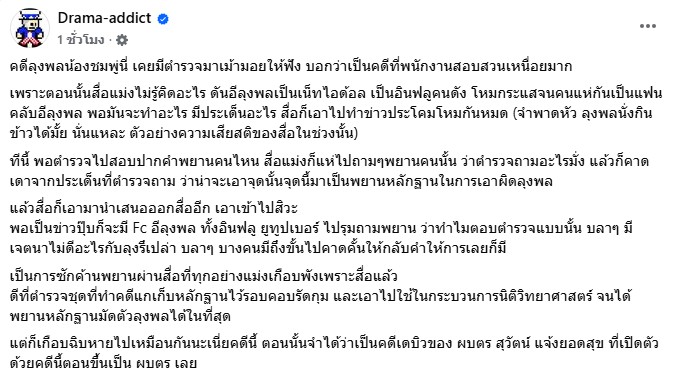 แล้วสื่อก็เอามานำเสนอออกสื่ออีก เอาเข้าไปสิวะ พอเป็นข่าวปุ๊บก็จะมี Fc อีลุงพล ทั้งอินฟลู ยูทูปเบอร์ ไปรุมถามพยาน ว่าทำไมตอบตำรวจแบบนั้น บลาๆ มีเจตนาไม่ดีอะไรกับลุงรึเปล่า บลาๆ บางคนมีถึงขั้นไปคาดคั้นให้กลับคำให้การเลยก็มี