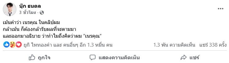 โดย นุ๊ก โพสต์ข้อความว่า “เม้นคำว่า เนรคุณ ในคลิปผมกล้าเม้น ก็ต้องกล้ารับผลที่จะตามมา และออกมาอธิบาย ว่าทำไมถึงคิดว่าผม เนรคุณ”