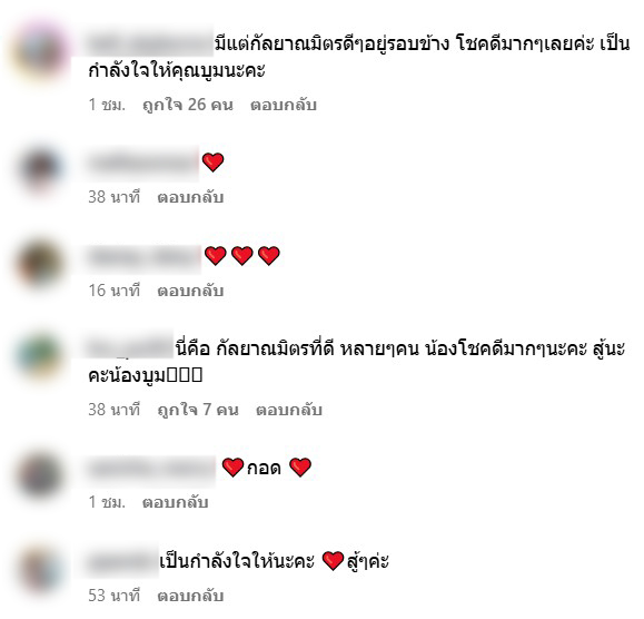 คอมเมนต์กันรัวๆเลยว่า มีแต่กัลยาณมิตรดีๆอยู่รอบข้าง โชคดีมากๆเลยค่ะ เป็นกำลังใจให้คุณบูมนะคะ , นี่คือ กัลยาณมิตรที่ดี หลายๆคน น้องโชคดีมากๆนะคะ สู้นะคะน้องบูม🫶🏻🤍 , ❤️กอด ❤️ , เป็นกำลังใจให้นะคะ ❤️สู้ๆค่ะ