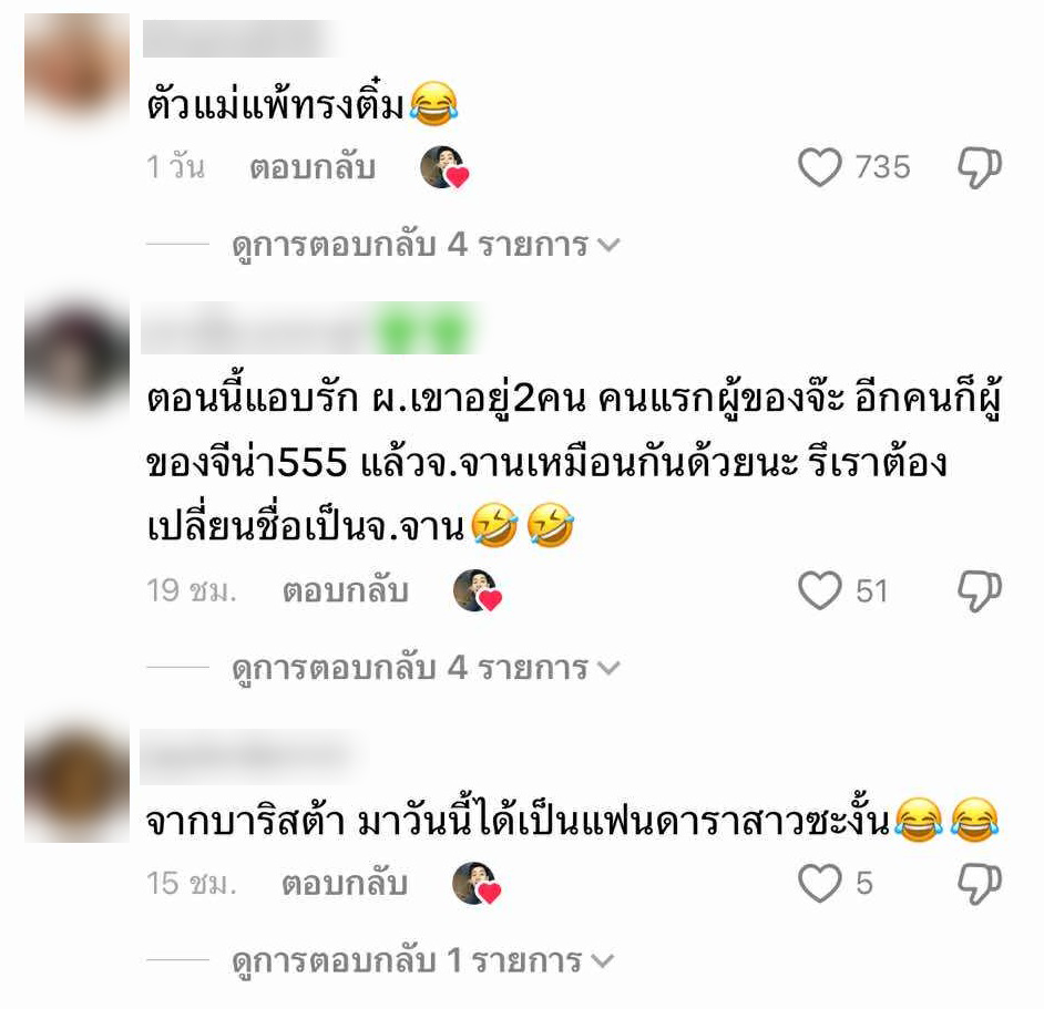 ซึ่งหลังจากที่เปิดตัวแล้วก็ทำแฟนๆเข้ามาคอมเมนต์แซวรัวๆเลยว่า จากบาริสต้า มาวันนี้ได้เป็นแฟนดาราสาวซะงั้น😂😂 ,ตอนนี้แอบรัก ผ.เขาอยู่2คน คนแรกผู้ของจ๊ะ อีกคนก็ผู้ของจีน่า555 แล้วจ.จานเหมือนกันด้วยนะ รึเราต้องเปลี่ยนชื่อเป็นจ.จาน🤣🤣