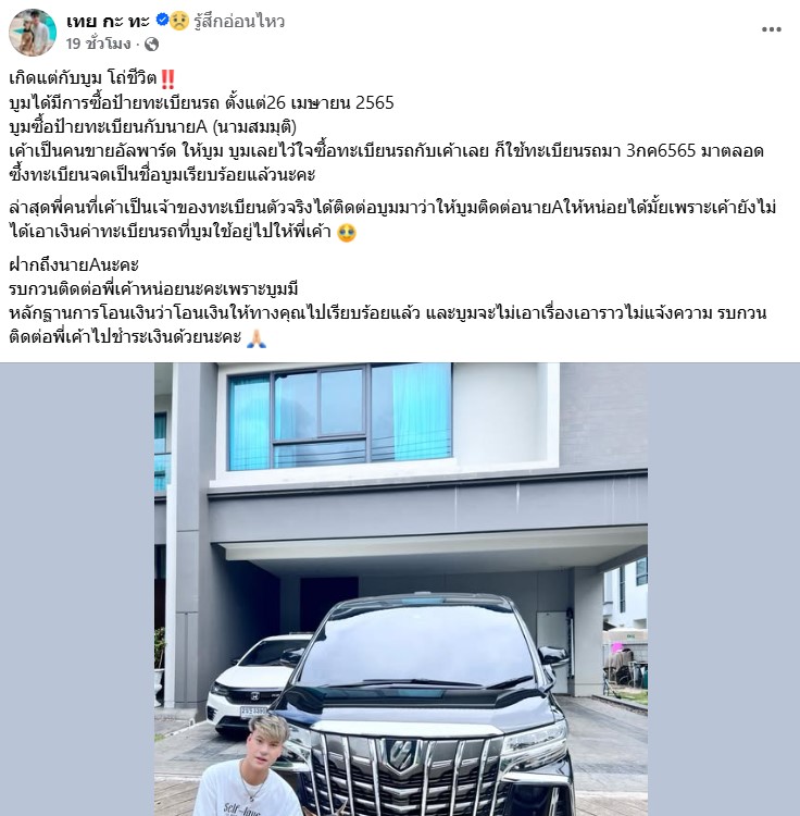 ล่าสุดพี่คนที่เค้าเป็นเจ้าของทะเบียนตัวจริงได้ติดต่อบูมมาว่าให้บูมติดต่อนาย A ให้หน่อยได้มั้ยเพราะเค้ายังไม่ได้เอาเงินค่าทะเบียนรถที่บูมใช้อยู่ไปให้พี่เค้า 🥹