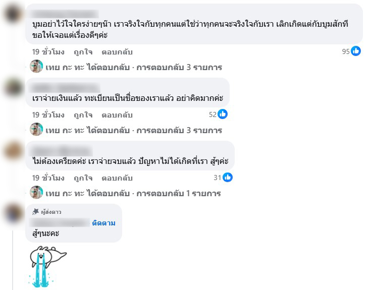 คอมเมนต์กันรัวๆเลยว่า บูมอย่าไว้ใจใครง่ายๆน๊า เราจริงใจกับทุกคนแต่ใช่ว่าทุกคนจะจริงใจกับเรา เลิกเกิดแต่กับบูมสักที ขอให้เจอแต่เรื่องดีๆค่ะ , เราจ่ายเงินแล้ว ทะเบียนเป็นชื่อของเราแล้ว อย่าคิดมากค่ะ , ไม่ต้องเครียดค่ะ เราจ่ายจบแล้ว ปัญหาไม่ได้เกิดที่เรา สู้ๆค่ะ