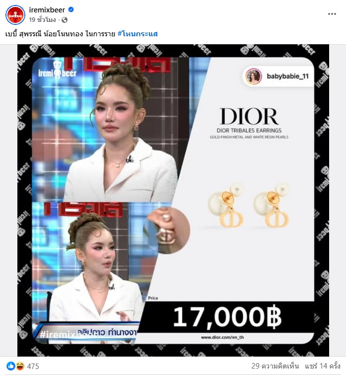 ซึ่งหลังจากที่จบรายการแล้วเพจดังอย่าง iremixbeer ก็ได้ออกมาเปิดเผยราคา ตุ้มหูของเบบี๋ ด้วย