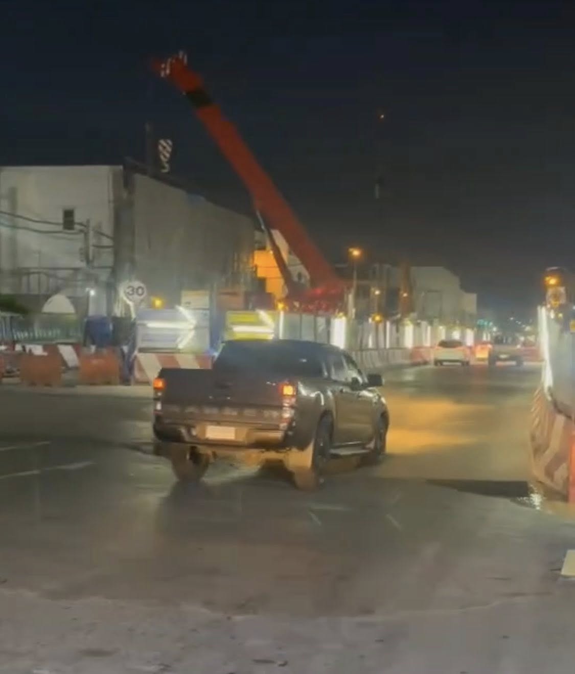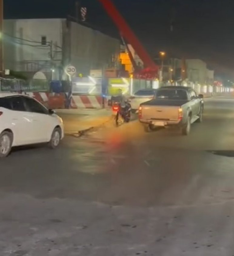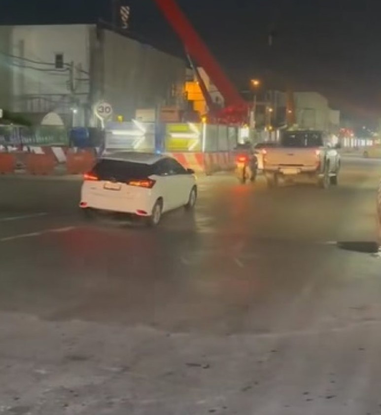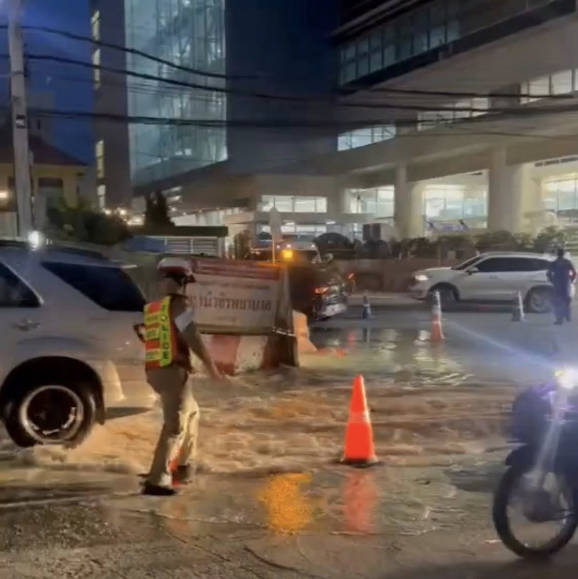 ซึ่งจะเห็นเลยว่าถนนเริ่มมีปัญหาแล้ว และต่อมาเจ้าหน้าที่ตำรวจจราจรก็สังเกตเห็นความผิดปกติของน้ำที่ค่อยๆไหลออกมา