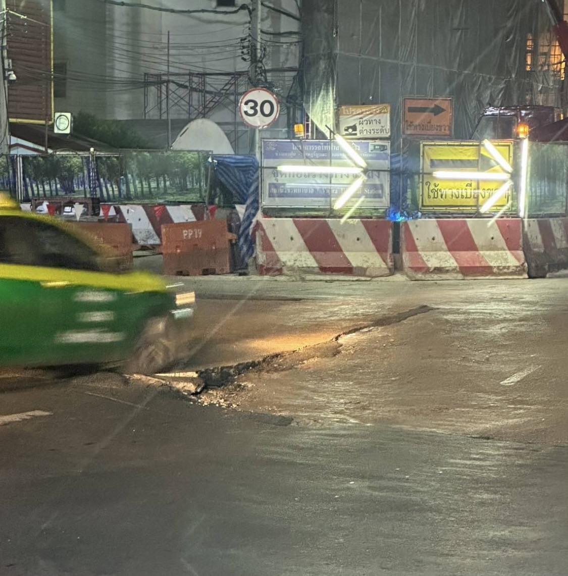 พร้อมระบุว่า “สภาพถนน ก่อนทรุดตัว พบมีน้ำท่วมขัง ถนนเริ่มยุบตัว เจ้าหน้าที่นำกรวยมาวางกั้นไม่ให้รถขับผ่าน ป้องกันเหตุ”