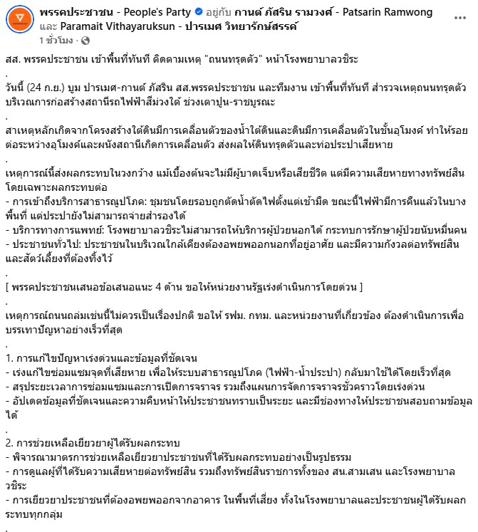 เหตุการณ์ถนนถล่มเช่นนี้ไม่ควรเป็นเรื่องปกติ ขอให้ รฟม. กทม. และหน่วยงานที่เกี่ยวข้อง ต้องดำเนินการเพื่อบรรเทาปัญหาอย่างเร็วที่สุด