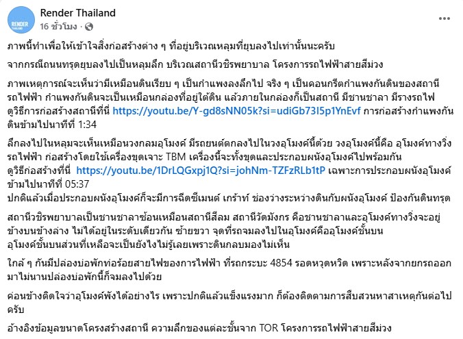 ล่าสุด ทางเพจเฟซบุ๊ก Render Thailand ได้ออกมาเปิดเผยว่า ภาพนี้ทำเพื่อให้เข้าใจสิ่งก่อสร้างต่าง ๆ ที่อยู่บริเวณหลุมที่ยุบลงไปเท่านั้นนะครับ