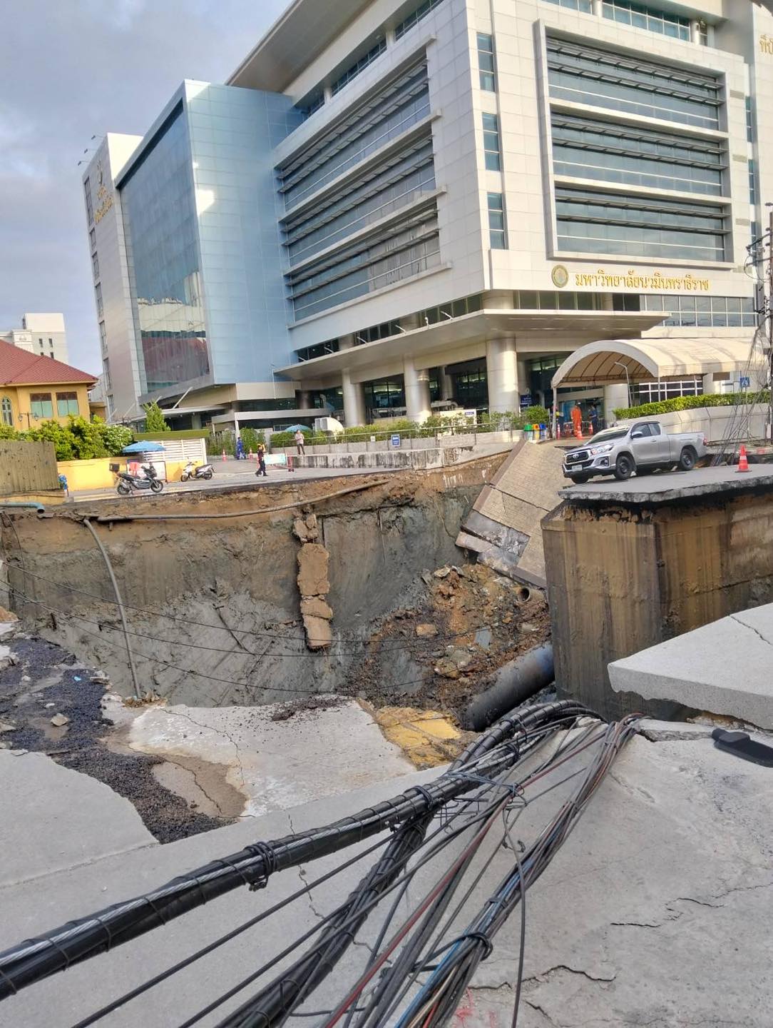 ลักษณะที่เกิดเหตุเป็นถนนทรุดตัวขนาดใหญ่ เป็นหลุมกว้างประมาณ 30 x 30 เมตร ลึก 50 เมตร ตั้งแต่หน้าอาคารของ รพ.วชิรพยาบาล