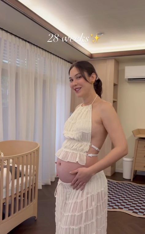 พร้อมเขียนแคปชั่น “มามี้เริ่มจะตื่นเต้นแล้วคับ #เจ้าลูกชายจอมถีบ ..เขินพุงจุง”