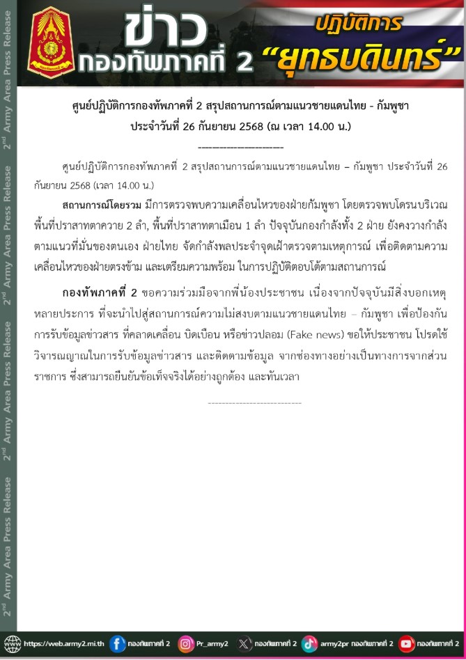 เรียกได้ว่าสถานการณ์ชายแดนในตอนนี้ยังคงตรึงเครียด และน่าเป็นห่วง โดยทางด้านศูนย์ปฏิบัติการกองทัพภาคที่ 2 สรุปสถานการณ์ตามแนวชายแดนไทย – กัมพูชา ประจำวันที่ 26 ก.ย.68 สถานการณ์โดยรวม