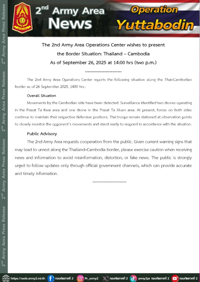 มีการตรวจพบความเคลื่อนไหวของฝ่ายกัมพูชา โดยตรวจพบโดรนบริเวณพื้นที่ปราสาทตาควาย 2 ลำ,