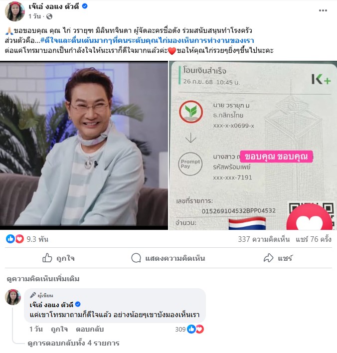 ระบุว่า ” 🙏🏻ขอขอบคุณ คุณ ไก่ วรายุฑ มิลินทจินดา ผู้จัดละครชื่อดัง ร่วมสนับสนุนทำโรงครัว