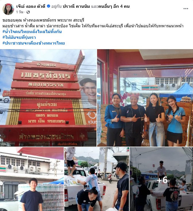 ระบุว่า ” ขอขอบคุณ ห้างทองเพชรมังกร พระบาท สระบุรีมอบข้าวสาร น้ำดื่ม มาม่า ปลากระป๋อง ไข่เค็ม ให้กับทีมงานเจ๊เอ๋สระบุรี เพื่อนำไปมอบให้กับทหารแนวหน้า #น้ำใจคนไทยหลั่งไหลไม่ทิ้งกัน #ให้มันจบที่รุ่นเรา #ประชาชนจะเคียงข้างทหารไทย ”