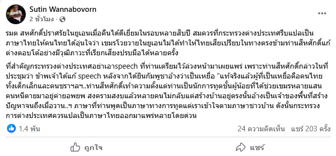 ระบุว่า ” รมต สหศักดิ์ปราศรัยในยูเอนเมื่อคืนได้ดีเยี่ยมในรอบหลายสิบปี สมควรที่กระทรวงต่างประเทศรีบแปลเป็นภาษาไทยให้คนไทยได้อุ่นใจว่า