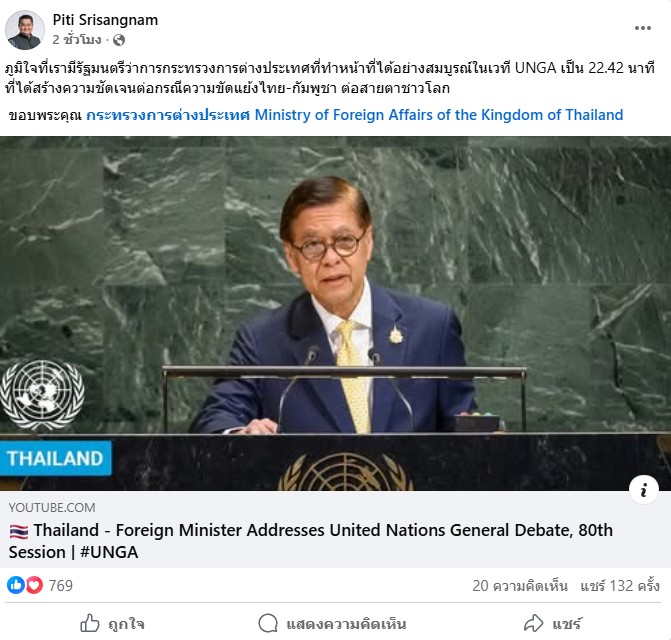 ได้โพสตข้อความระบุว่า ” ภูมิใจที่เรามีรัฐมนตรีว่าการกระทรวงการต่างประเทศที่ทำหน้าที่ได้อย่างสมบูรณ์ในเวที UNGA เป็น 22.42 นาที ที่ได้สร้างความชัดเจนต่อกรณีความขัดแย้งไทย-กัมพูชา ต่อสายตาชาวโลก