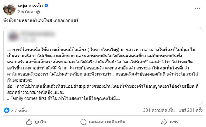 ล่าสุด กรรชัย แชร์โพสต์ของหลาน ระบุว่า ” …. การที่ใครคนนึง ใช้ความเป็นคนมีชื่อเสียง ( ในทางไหนไม่รู้) มากล่าวหา กล่าวอ้างในเรื่องที่ไม่มีมูล