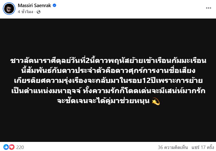การงานชื่อเสียงเกียรติยศความรุ่งเรืองจะกลับมาในรอบ 12 ปี เพราะการย้ายเป็นตำแหน่งมหาอุจจ์ ทั้งความรักก็โดดเด่นจะมีเสน่ห์มากรักจะชัดเจนจะได้คู่มาช่วยหนุน 💫”