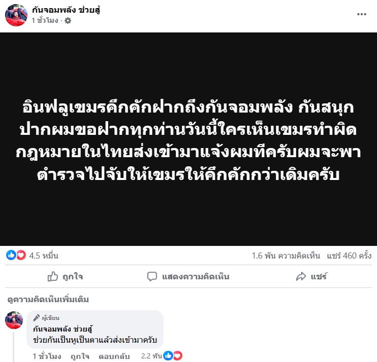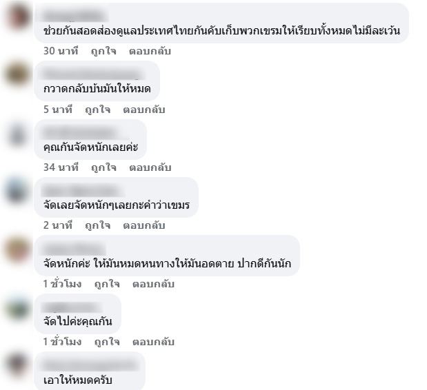 คอมเมนต์กันรัวๆเลยว่า ช่วยกันสอดส่องดูแลประเทศไทยกันคับเก็บพวกเขรมให้เรียบทั้งหมดไม่มีละเว้น , กวาดกลับบ้านมันให้หมด , คุณกันจัดหนักเลยค่ะ , จัดเลยจัดหนักๆเลยกะคำว่าเขมร