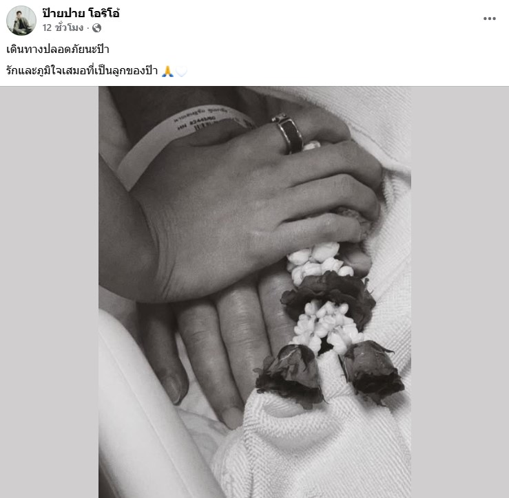 โดย ป๊ายปาย ได้เผยภาพมือของตัวเองที่กุมมือของคุณพ่อ โดยมีพวงมาลัยมาไหว้คุณพ่อด้วย พร้อมระบุว่า “เดินทางปลอดภัยนะป๊า รักและภูมิใจเสมอที่เป็นลูกของป๊า 🙏🤍”