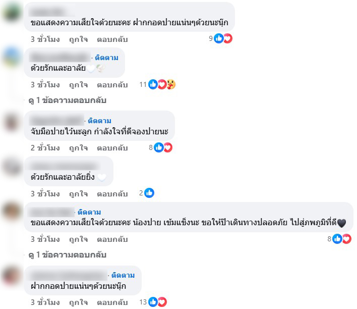 คอมเมนต์กันรัวๆเลยว่า ขอแสดงความเสียใจด้วยนะคะ ฝากกอดปายแน่นๆด้วยนะนุ๊ก , ด้วยรักและอาลัย🤍🕊️ , จับมือปายไว้นะลูก กำลังใจที่ดีจองปายนะ , ด้วยรักและอาลัยยิ่ง 🤍
