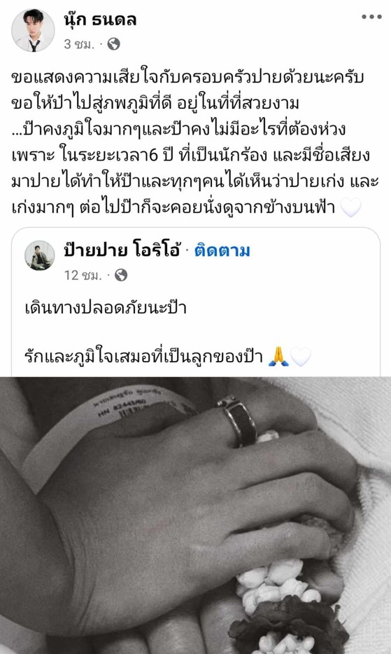 พร้อมลงแคปชั่นว่า “ขอแสดงความเสียใจกับครอบครัวปายด้วยนะครับ ขอให้ป๋าไปสู่ภพภูมิที่ดี อยู่ในที่ที่สวยงาม …ป๊าคงภูมิใจมากๆและป๊าคงไม่มีอะไรที่ต้องห่วง