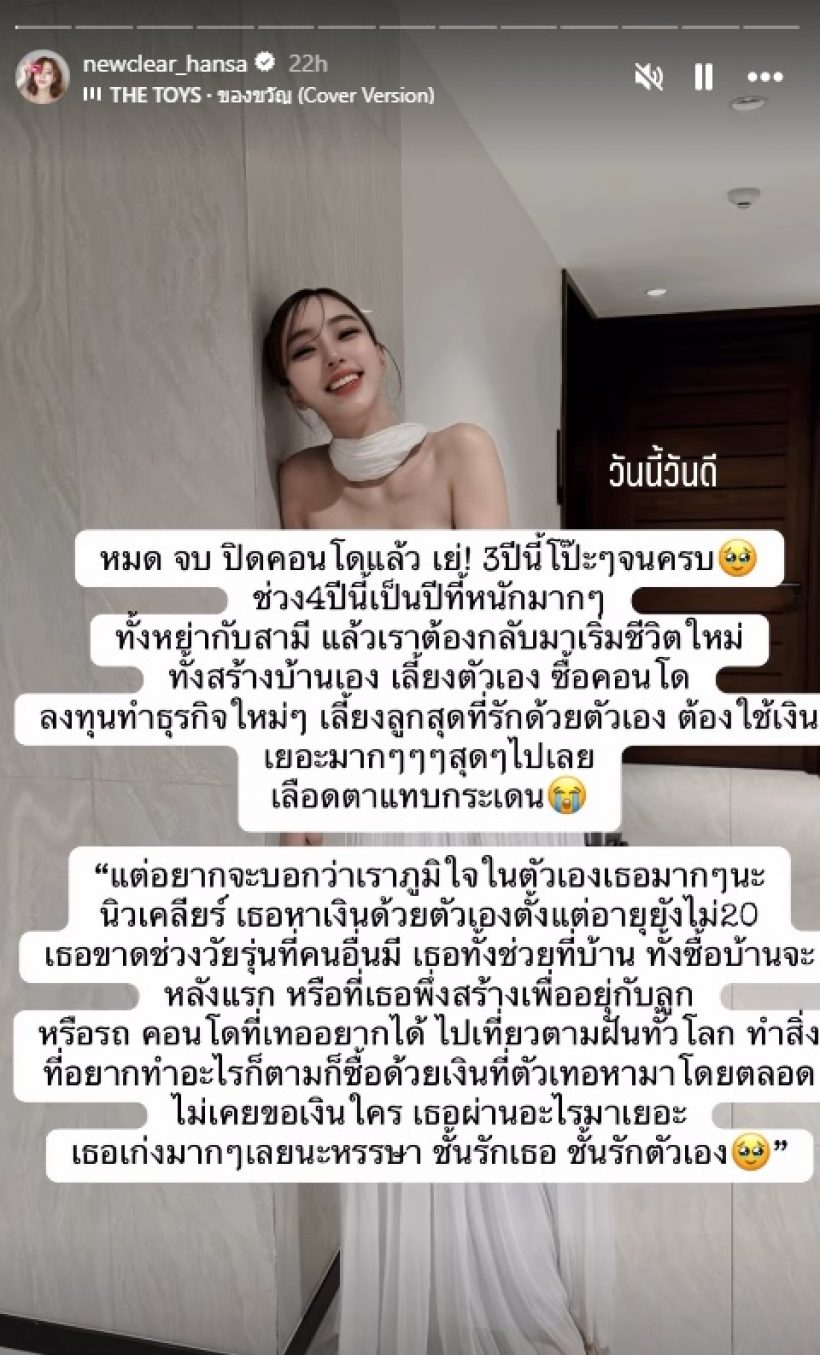 ล่าสุด นิวเคลียร์ ได้โพสต์ข่าวดีผ่านไอจีสตอรี่ว่า “วันนี้วันดี หมด จบ ปิดคอนโดแล้ว เย่! 3 ปีนี้โป๊ะๆจนครบ