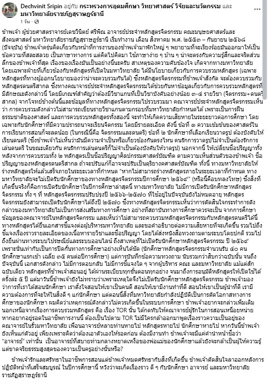 ข้าพเจ้าจะมีแค่คำนำหน้าชื่อว่า “อาจารย์” เท่านั้น เป็นอาจารย์ที่สบายท่ามกลางหยาดเหงื่อของพ่อแม่ของนักศึกษาแล้วยังจะกล้าเป็นผู้ให้ความรู้แต่ขาดจริยธรรมสูงสุดของความเป็นครูอย่างนั้นหรือ? ข้าพเจ้ารักและศรัทธาในอาชีพการสอนแต่ข้าพเจ้าหมดศรัทธากับสิ่งที่เกิดขึ้น ข้าพเจ้าตัดสินใจลาออกหลังการปฏิบัติหน้าที่เสร็จสมบูรณ์ ในปีการศึกษานี้ หวังว่าจะเกิดเรื่องราว ดี ๆ กับนักศึกษา อาจารย์ และมหาวิทยาลัยราชภัฏสุราษฎร์ธานี”