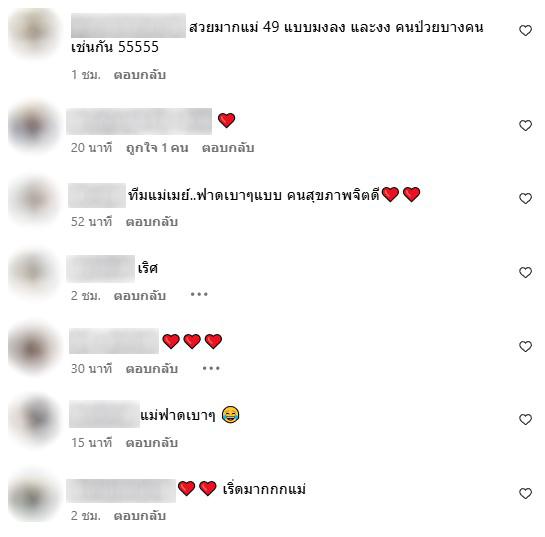ท่ามกลางแฟนๆที่เข้ามาคอมเมนต์สนั่นเลยว่า สวยมากแม่ 49 แบบมงลง และงง คนป่วยบางคนเช่นกัน 55555 , ❤️ , ทีมแม่เมย์..ฟาดเบาๆแบบ คนสุขภาพจิตดี❤️❤️ , เริศ ,❤️❤️❤️ , แม่ฟาดเบาๆ 😂 , ❤️❤️ เริ่ดมากกกแม่