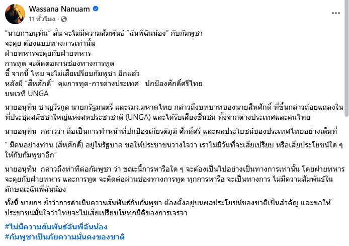 เรียกได้ว่ายังคงน่าจับตามอง สำหรับสถานการณ์ชายแดนไทย-กัมพูชา ในตอนนี้ โดยล่าสุด เฟซบุ๊ก Wassana Nanuam ได้ออกมาโพสต์ข้อความเอาไว้ว่า ““นายกฯอนุทิน” ลั่น จะไม่มีความสัมพันธ์ “ฉันพี่ฉันน้อง” กับกัมพูชา