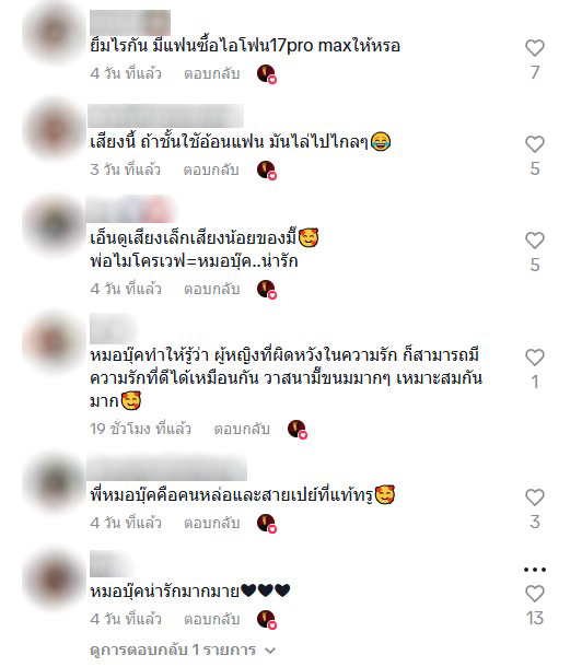 ยิ้มไรกัน มีแฟนซื้อไอโฟน17pro maxให้หรอ , เสียงนี้ ถ้าชั้นใชัอ้อนแฟน มันไล่ไปไกลๆ😂 , เอ็นดูเสียงเล็กเสียงน้อยของมี๊🥰พ่อไมโครเวฟ=หมอบุ๊ค..น่ารัก , หมอบุ๊คทำให้รู้ว่า ผู้หญิงที่ผิดหวังในความรัก ก็สามารถมีความรักที่ดีได้เหมือนกัน วาสนามี๊ขนมมากๆ เหมาะสมกันมาก🥰 ,พี่หมอบุ๊คคือคนหล่อและสายเปย์ที่แท้ทรู🥰 , หมอบุ๊คน่ารักมากมาย❤❤❤