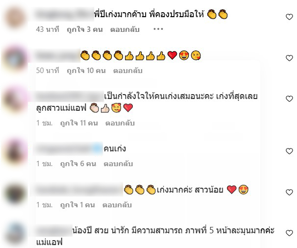 พี่ๆแฟนคลับเข้ามายินดีกันรัวๆเลยว่า พี่ปีเก่งมากค๊าบ พี่คองปรบมือให้ 👏👏 , 👏👏👏👏👍👍 , เป็นกำลังใจให้คนเก่งเสมอนะคะ เก่งที่สุดเลยลูกสาวแม่แอฟ 👏🏻👍🏻🥰❤️ , คนเก่ง , 👏เก่งมากค่ะ สาวน้อย ❤️😍