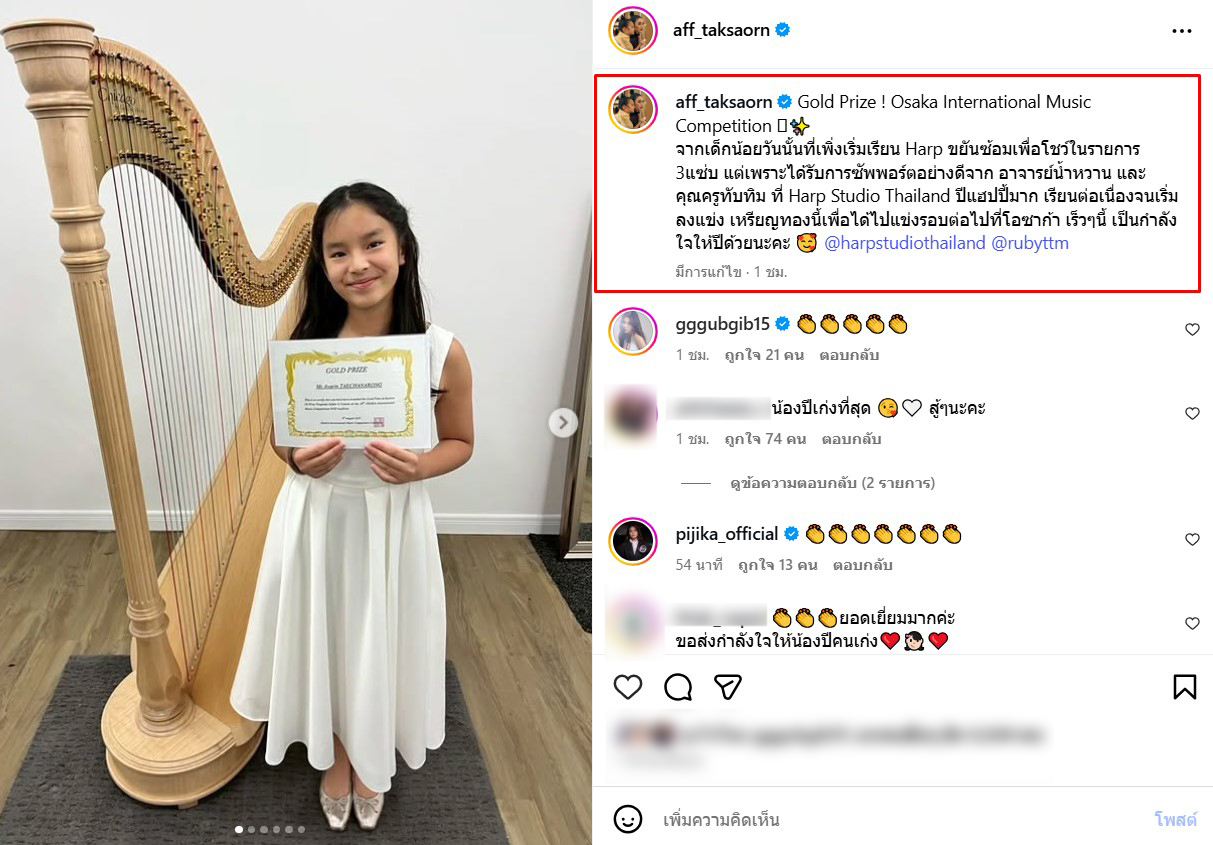 โดย แอฟ โพสต์ภาพ น้องปีใหม่ พร้อมลงแคปชั่นว่า “Gold Prize ! Osaka International Music Competition ✨️ จากเด็กน้อยวันนั้นที่เพิ่งเริ่มเรียน Harp ขยันซ้อมเพื่อโชว์ในรายการ 3 แซ่บ
