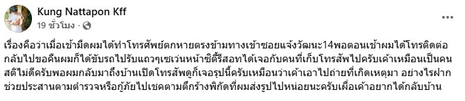เรียกได้ว่ากลายเป็นอีกหนึ่งเรื่องราว ที่ถูกแชร์เป็นจำนวนมากในโลกออนไลน์ หลังผู้ใช้เฟซบุ๊ก Kung Nattapon Kff ได้โพสต์ภาพพร้อมข้อความ ระบุว่า “เรื่องคือว่า เมื่อเช้ามืดผมได้ทำโทรศัพย์ตกหาย