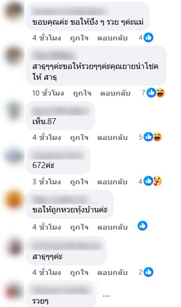 แฟนๆเข้ามาคอมเมนต์กันรัวๆเลยว่า ขอบคุณค่ะ ขอให้ปังๆรวยๆค่ะแม่ , สาธุๆๆค่ะขอให้รวยๆๆค่ะคุณยายนำโชคให้ สาธุ , เห็น.87 , 672ค่ะ , ขอให้ถูกหวยทุ้งบ้านค่ะ , สาธุๆๆค่ะ