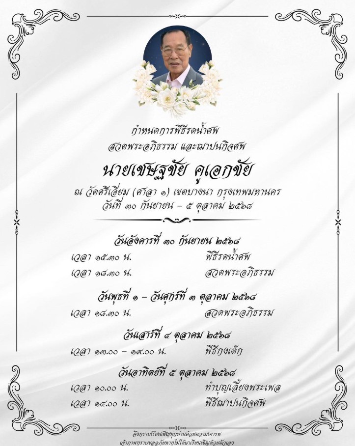 ในส่วนของกำหนดการนั้น จะมีพิธีสวดอภิธรรมถึงวันศุกร์ วันเสาร์ทำพิธีตามประเพณีจีน และวันอาทิตย์จะเป็นพิธีฌาปนกิจ”