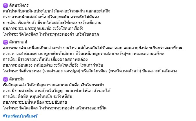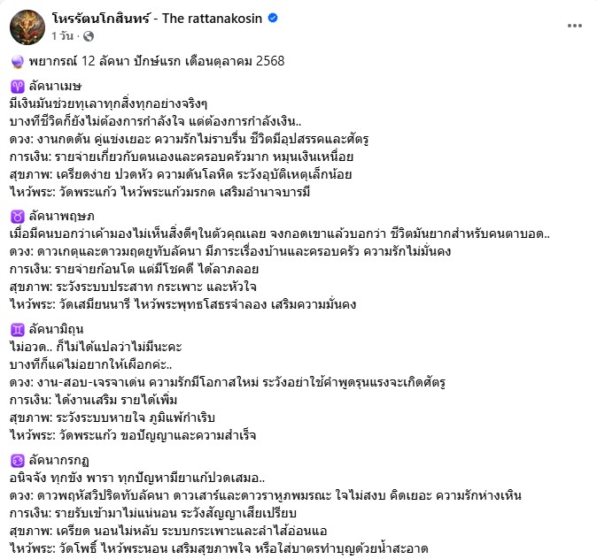 ต้องบอกเลยว่ารีบเช็กด่วนๆเลยค่ะ ก่อนหน้านี้เมื่อวันที่ 29 ก.ย. 68 ที่ผ่านมา เพจเฟซบุ๊ก โหรรัตนโกสินทร์ – The rattanakosin ได้ออกมาโพสต์เปิดคำทนายดวงชะตาแล้ว