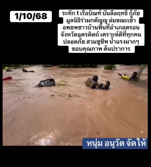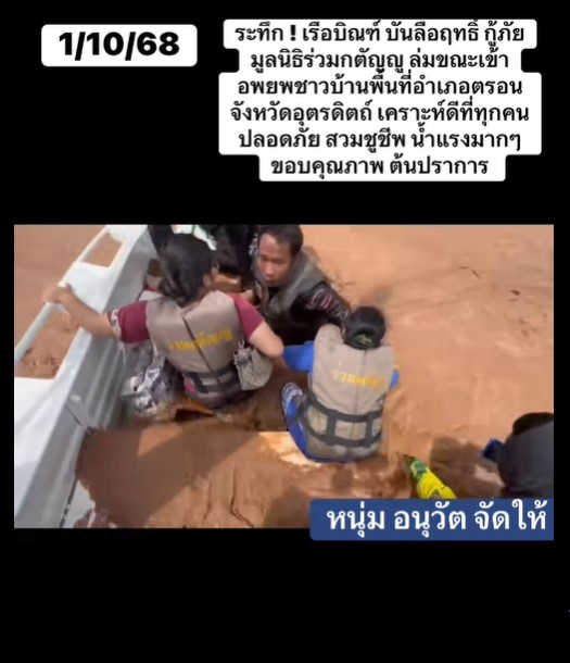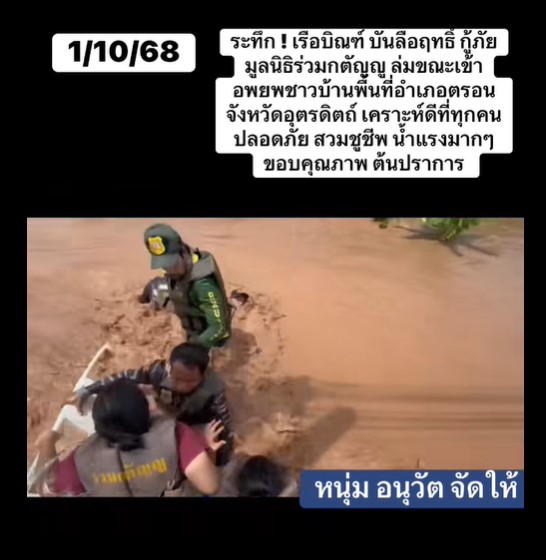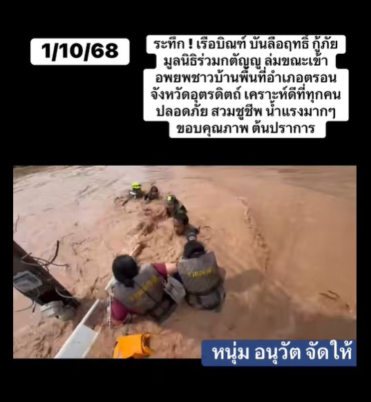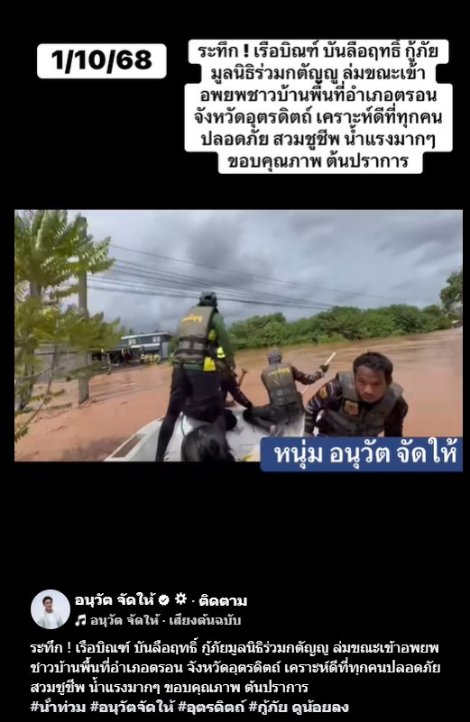 โดย อนุวัต ได้ระบุแคปชั่นว่า “ระทึก ! เรือบิณฑ์ บรรลือฤทธิ์ กู้ภัยมูลนิธิร่วมกตัญญู ล่มขณะเข้าอพยพชาวบ้านพื้นที่อำเภอตรอน จังหวัดอุตรดิตถ์ เคราะห์ดีที่ทุกคนปลอดภัย สวมชูชีพ น้ำแรงมากๆ ขอบคุณภาพ ต้นปราการ”