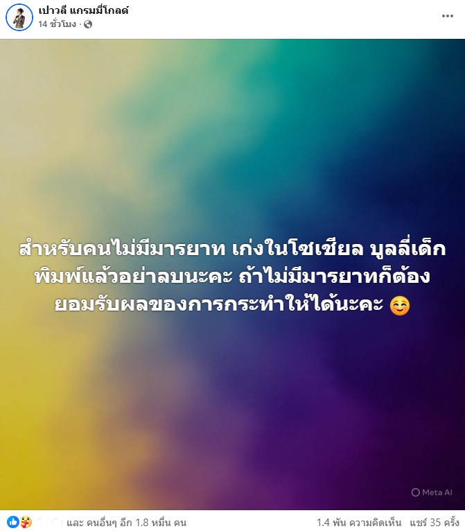 แต่ล่าสุดทำเอาหัวอกคนเป็นแม่เดือดไม่น้อยเลยค่ะ หลังมีคนมาบูลลี่ลูกสาวสุดที่รัก โดย เปา โพสต์ข้อความว่า “สำหรับคนไม่มีมารยาท เก่งในโซเชียล บูลลี่เด็ก พิมพ์แล้วอย่าลบนะคะ ถ้าไม่มีมารยาทก็ต้องยอมรับผลของการกระทำให้ได้นะคะ ☺️”