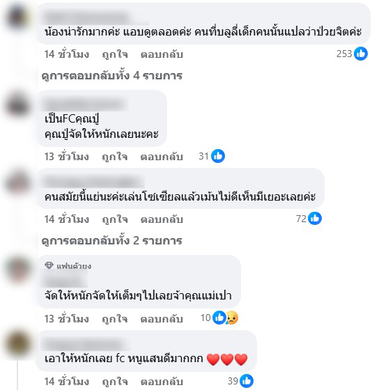 คอมเมนต์กันรัวๆเลยว่า น้องน่ารักมากค่ะ แอบดูตลอดค่ะ คนที่บลูลี่เด็กคนนั้นแปลว่าป่วยจิตค่ะ , เป็นFCคุณปู่คุณปู่จัดให้หนักเลยนะคะ , คนสมัยนี้แย่นะค่ะเล่นโซเซียลแล้วเม้นไม่ดีเห็นมีเยอะเลยค่ะ , จัดให้หนักจัดให้เต็มๆไปเลยจ้าคุณแม่เปา
