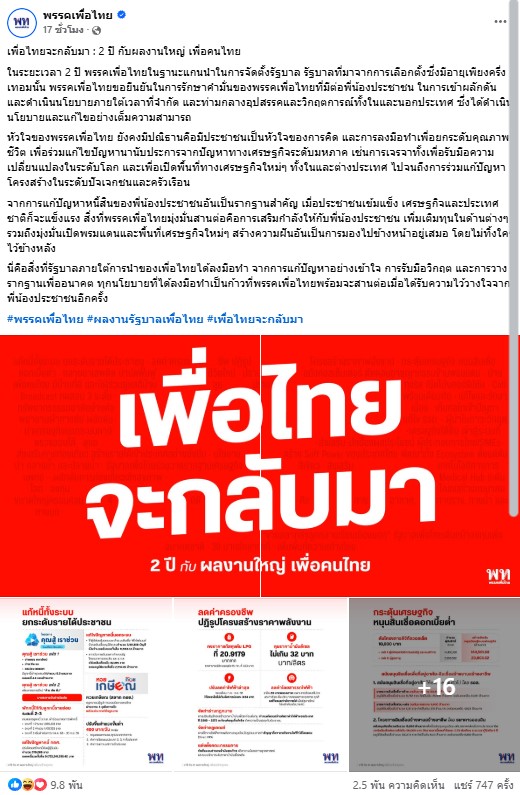 โดยเฟซบุ๊กพรรคเพื่อไทย โพสต์ผลงานรัฐบาลเพื่อไทย พร้อมระบุว่า เพื่อไทยจะกลับมา : 2 ปี กับผลงานใหญ่ เพื่อคนไทย ในระยะเวลา 2 ปี พรรคเพื่อไทยในฐานะแกนนำในการจัดตั้งรัฐบาล รัฐบาลที่มาจากการเลือกตั้งซึ่งมีอายุเพียงครึ่งเทอมนั้น