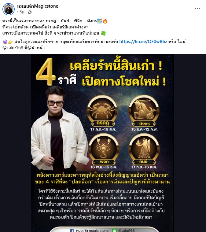 โดย หมอเค้ก ทำนายว่า ” ช่วงนี้เป็นเวลาทองของ กรกฎ – กันย์ – พิจิก – มังกร🌈🔥 ที่ควรใช้พลังดาวปิดหนี้เก่า เคลียร์ปัญหาค้างคา เพราะเมื่อภาระหมดไป สิ่งดี ๆ จะเข้ามาแทนที่แน่นอน 🍀 ”
