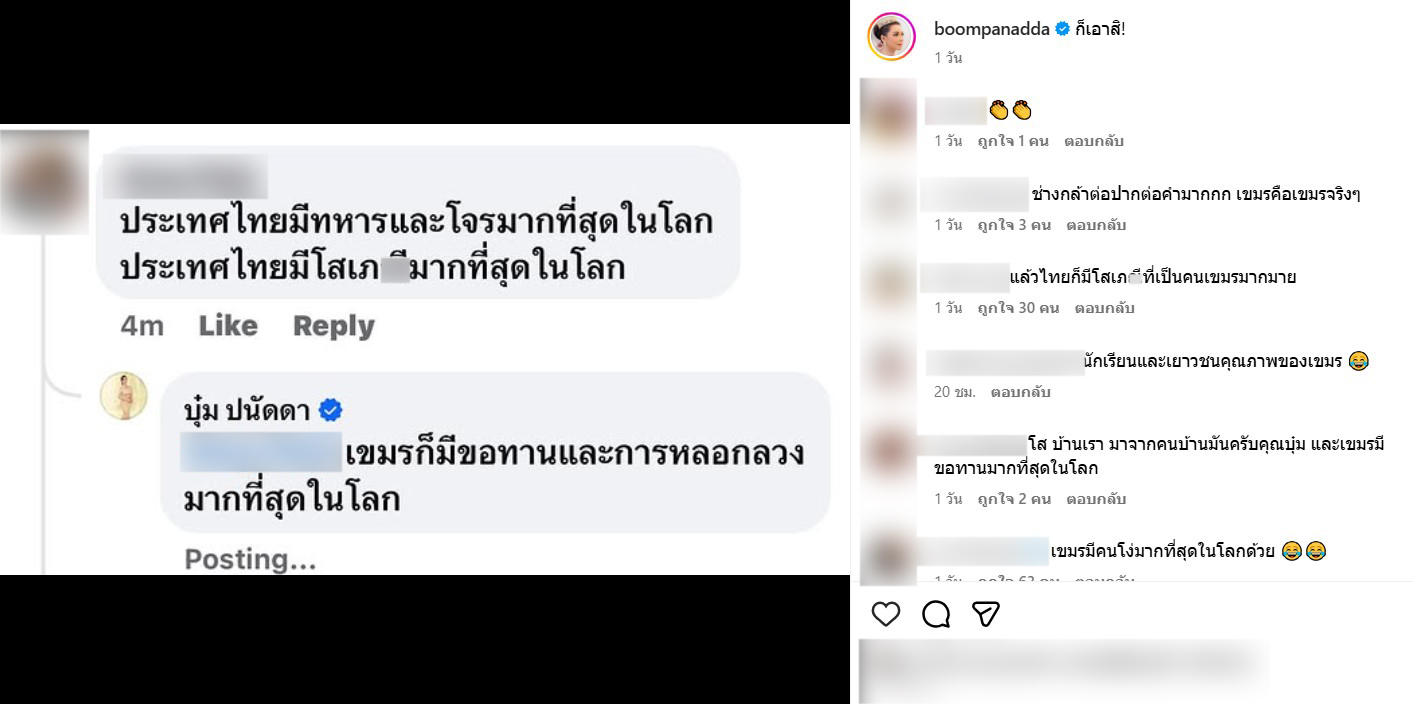 งานนี้ บุ๋ม ก็สุดจะทนเหมือนกันค่ะ เพราะว่าได้ฟาดกลับทันทีว่า “เขมรก็มีขอทานและการหลอกลวงมากที่สุดในโลก”