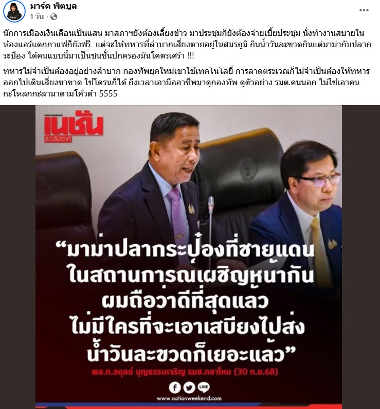 มาสภาฯยังต้องเลี้ยงข้าว มาประชุมก็ยังต้องจ่ายเบี้ยประชุม นั่งทำงานสบายในห้องแอร์แดกกาแฟก็ยังฟรี แต่จะให้ทหารที่ลำบากเสี่ยงตาย