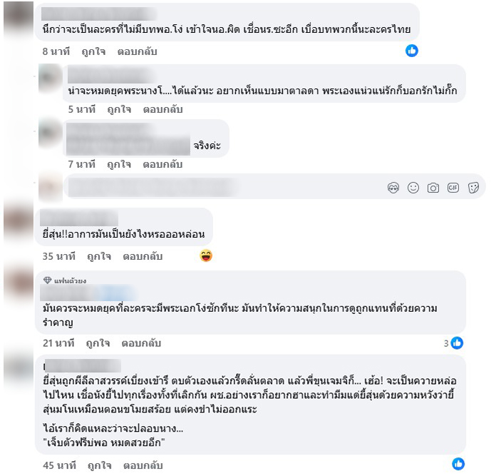 แถม เจ้าคุณพี่ (เจมส์จิ) ยังเชื่อด้วย งานนี้แฟนละครจึงออกมาวิจารณ์กันรัวๆเลยว่า น่าจะหมดยุคพระเอกโง่เชื่อคำลวงของตัวร้ายได้แล้ว แถมยังบอกเลยว่ายุคนี้ต้องละครที่พระนางแน่วแน่มั่นคงในความรักมากกว่า