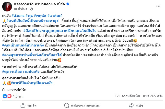 ขอบคุณข้อมูล : ดวงความรัก ทำนายดวง อ.เบิร์ด