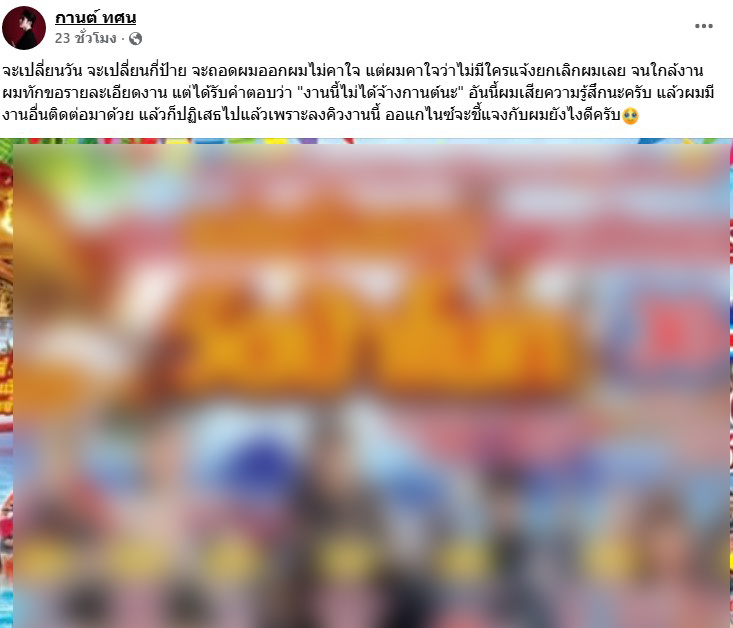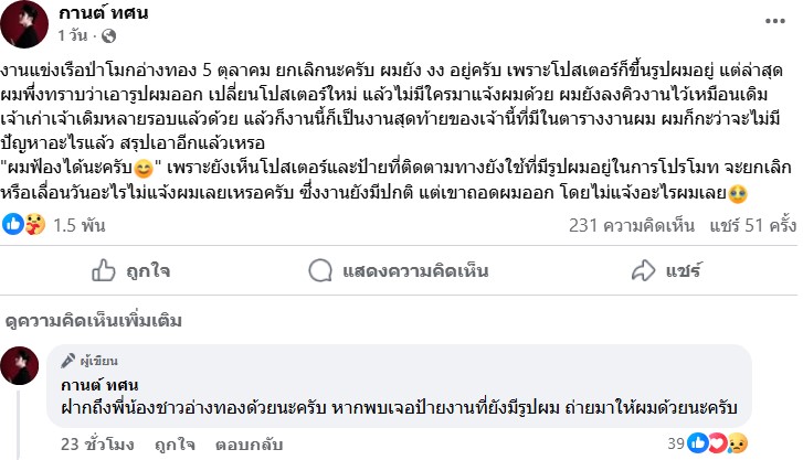 และต่อมาเจ้าตัวยังโพสต์อีกว่า ” จะเปลี่ยนวัน จะเปลี่ยนกี่ป้าย จะถอดผมออกผมไม่คาใจ แต่ผมคาใจว่าไม่มีใครแจ้งยกเลิกผมเลย จนใกล้งานผมทักขอรายละเอียดงาน