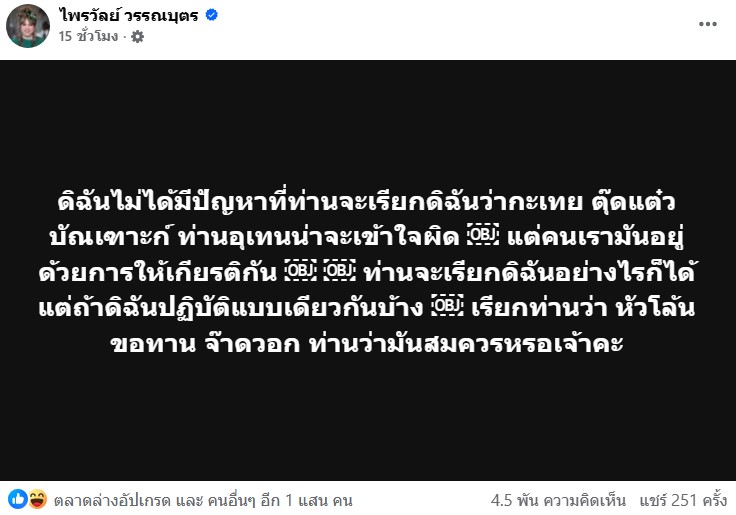 ไปทำเต้านมมาหรือเปล่า แต่งสวยเป็นกะเทย เป็นตุ๊ด เป็นแต๋วชัดๆ ใส่วิกด้วย ก็ไม่ยอมรับว่าตัวเองเป็นกะเทย เอาให้ชัดเจนไปเลยดีกว่าไหม ไปตัดออกให้หมด จะได้เป็นผู้หญิงเต็มตัว”