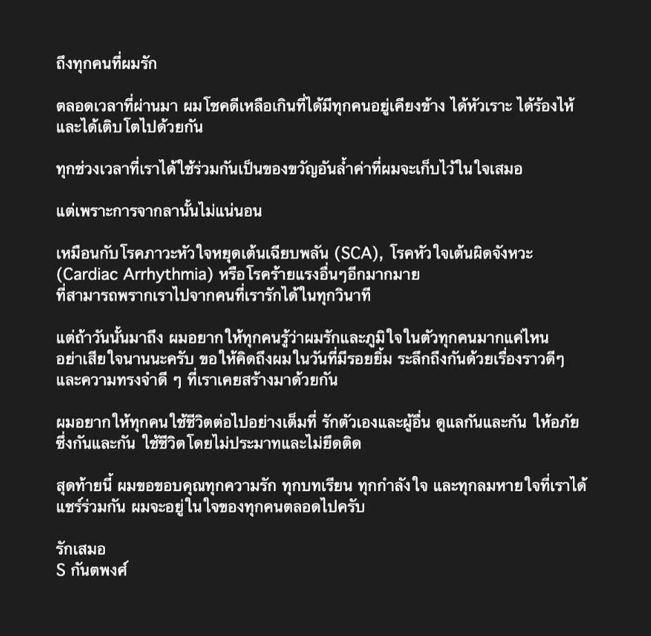ก่อนหน้านี้ทำเอาหลายๆ คนอดเป็นห่วงไม่ได้ สำหรับ เอส กันตพงศ์ โพสต์ข้อความในทำนองว่า “ตลอดเวลาที่ผ่านมา ผมโชคดีเหลือเกินที่ได้มีทุกคนอยู่เคียงข้าง ได้หัวเราะ ได้ร้องไห้และได้เติบโตไปด้วยกัน ผมอยากให้ทุกคนใช้ชีวิตต่อไปอย่างเต็มที่