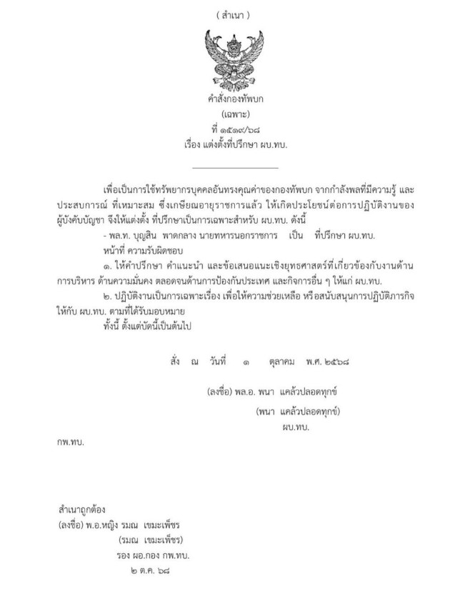 ทั้งนี้ ตั้งแต่บัดนี้เป็นต้นไป สั่ง ณ วันที่ 1 ตุลาคม 2568 พลเอกพนา แคล้วปลอดทุกข์ ผบ.ทบ.